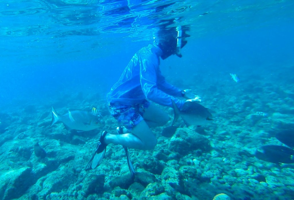 Snorkeling at Poipu Beach Park was very protected and Mackie seemed to be a Fish Whisperer as they flocked to him. The conditions were not as clear nor were there as many varieties of fish as we experienced in Anini Beach in May, but the reef was shallow and protected and you could see many up close.