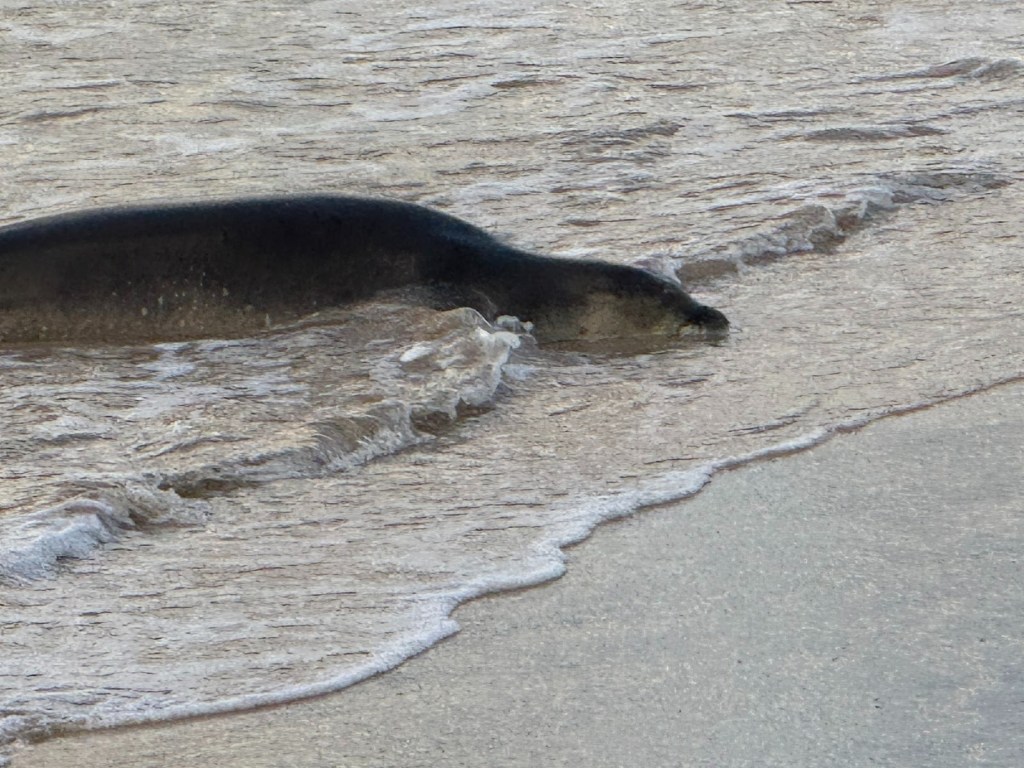 Early on the first morning, we discovered Boris, a monk seal, who squiggled up to the Brennacke Beach.