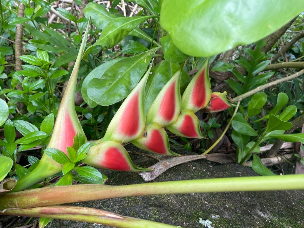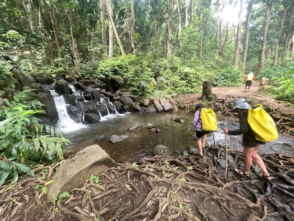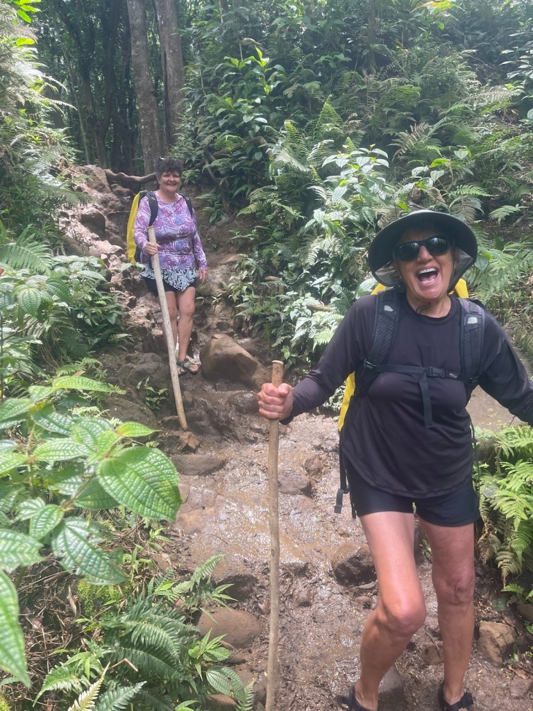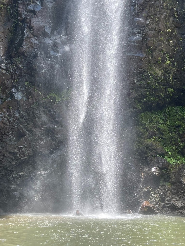 Levi was such a special guide as he played Uke and sang as we hiked. He exuded positivity as he told stories of his life and was hoping to wrestle a pig for a luau – he also loved to cook. What a man as he carried dumb bells in his pack for an extra workout while we washed all our problems out in the waterfall. The giant conch to summon us was also in that pack with the first aid equipment that luckily we never had to use. The waterfall was so incredible and Gertrud and Lisa dipped in them.