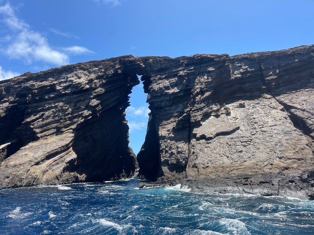 Johnathan tested the Lehua crater waters and found the current to be a bit strong for snorkeling so we juggled to a different spot. The snorkeling was disappointing compared to the Big Island and Maui. There was an underwater rock ledge about 15 feet down where most of the fish were as well as some arches that were a bit too deep for me. Only a few varieties of fish way down under. Returning to the boat there were a bunch of queasy green looking people and luckily I found some pretzels which helped with the rocking. We were underway and enjoying the rocky holes-in-the-wall of Niihau contrasting to the aqua blue waves.