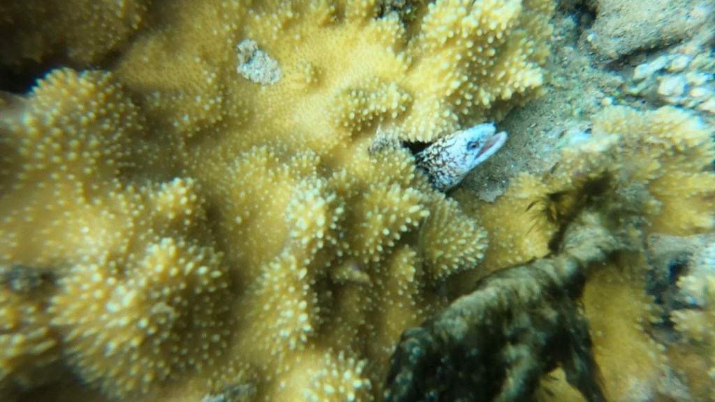 The water was beautifully warm, and I was out of the section where the wild windfoils were zooming along. This reef was in front of a tree wall that jetted out to the ocean, and in front of some houses that were protected by hedges. I was out for over an hour enjoying all the ocean life and even an eel.