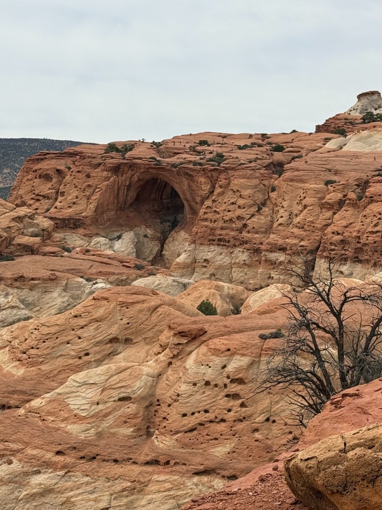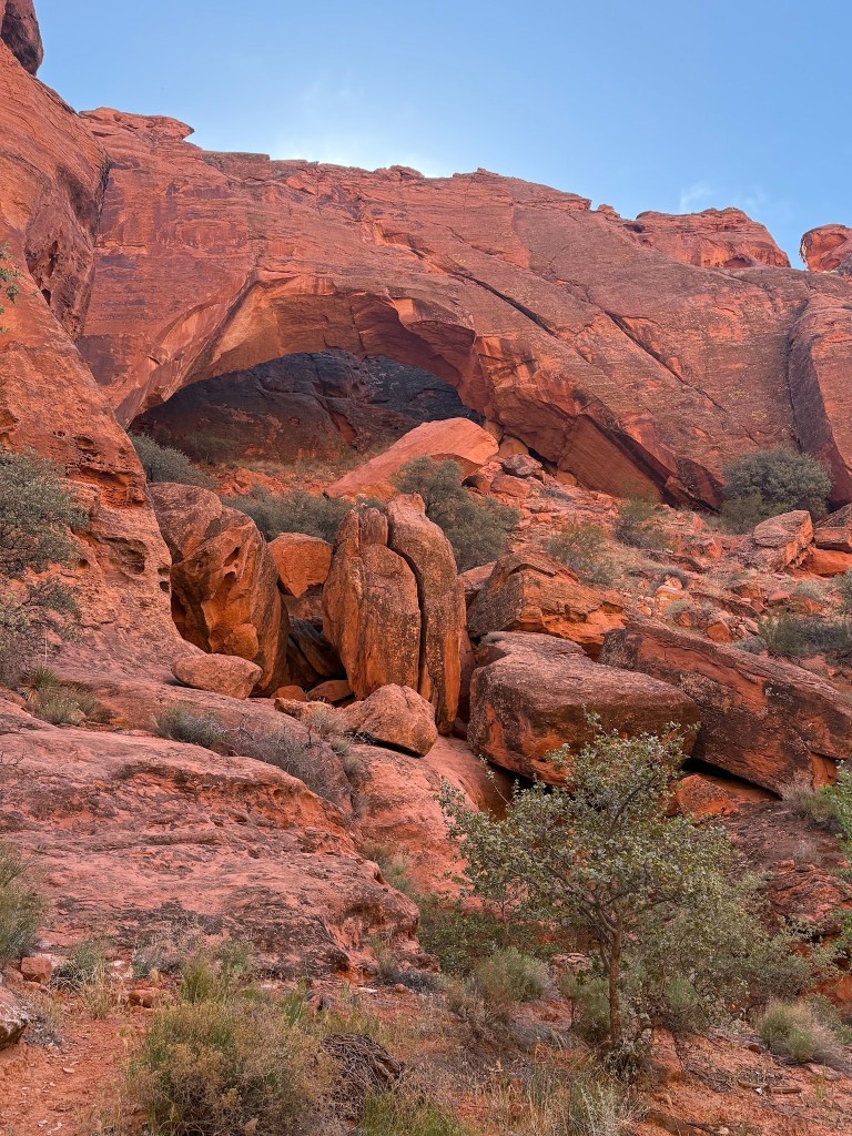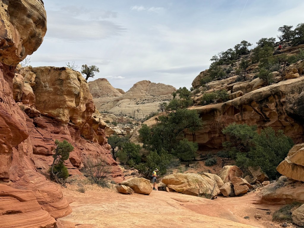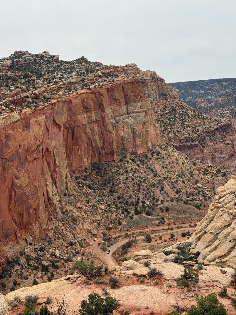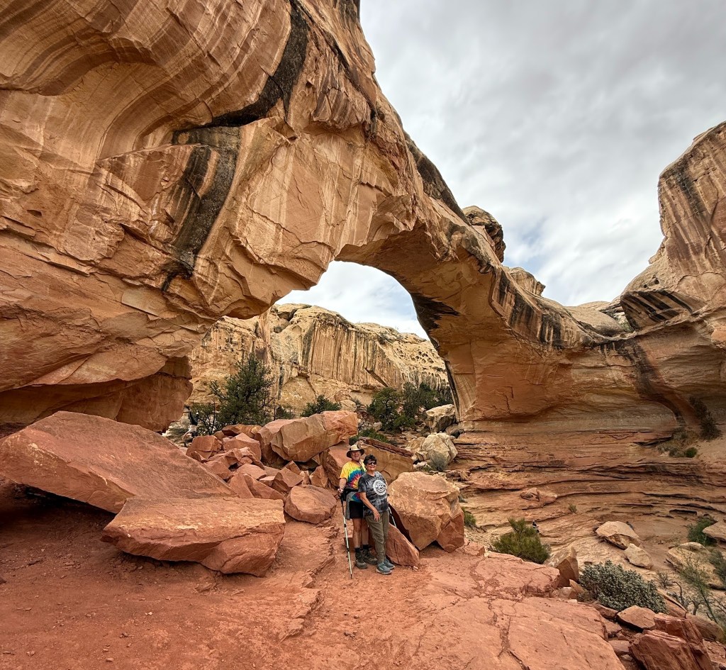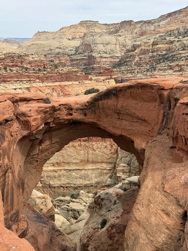 Cassidy Arch – named after Butch Cassidy whose boyhood home we also passed was on our top ten hikes of all time. Probably Top 5, but haven’t really constructed that list yet – so who knows. From Vinny’s Parking Spot to understand the hugeness of it all. There is a parking lot access after driving down the Grand Wash which is a dirt road that was very well maintained and turns into a trail. If you wanted a longer hike 10 miles, you could hike from the Fruita Campground on the Cohab Trail.