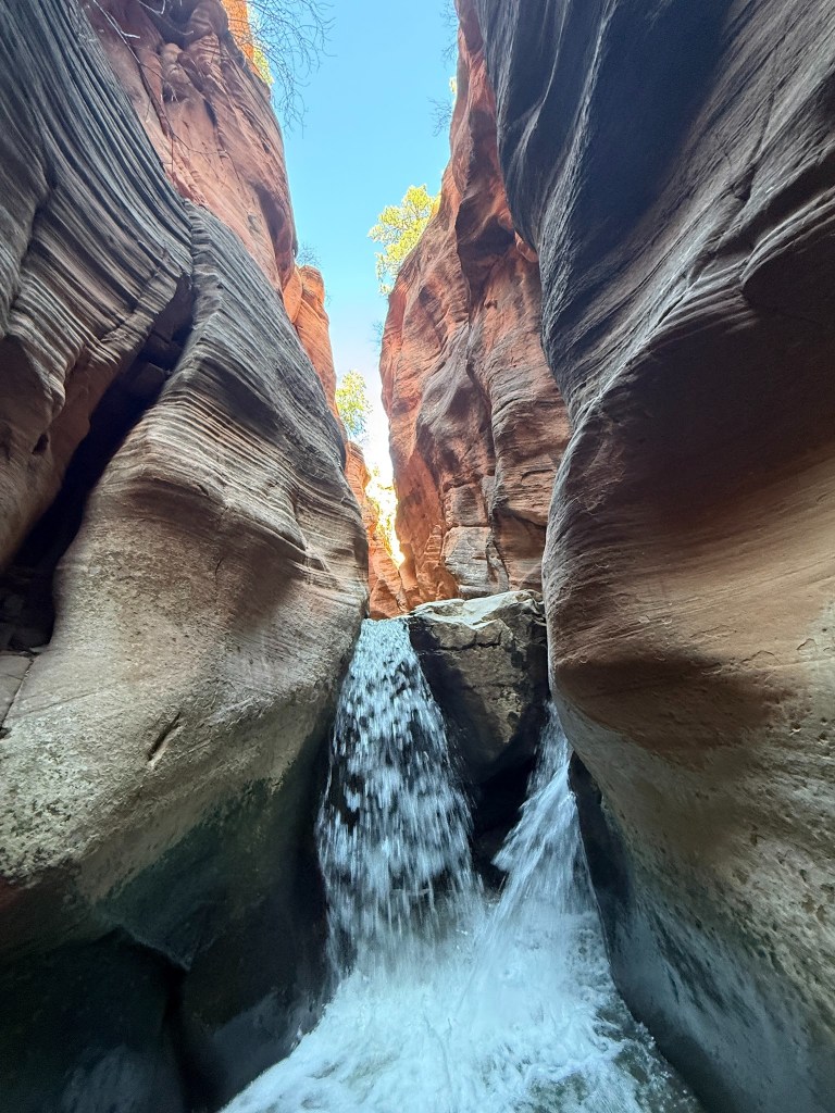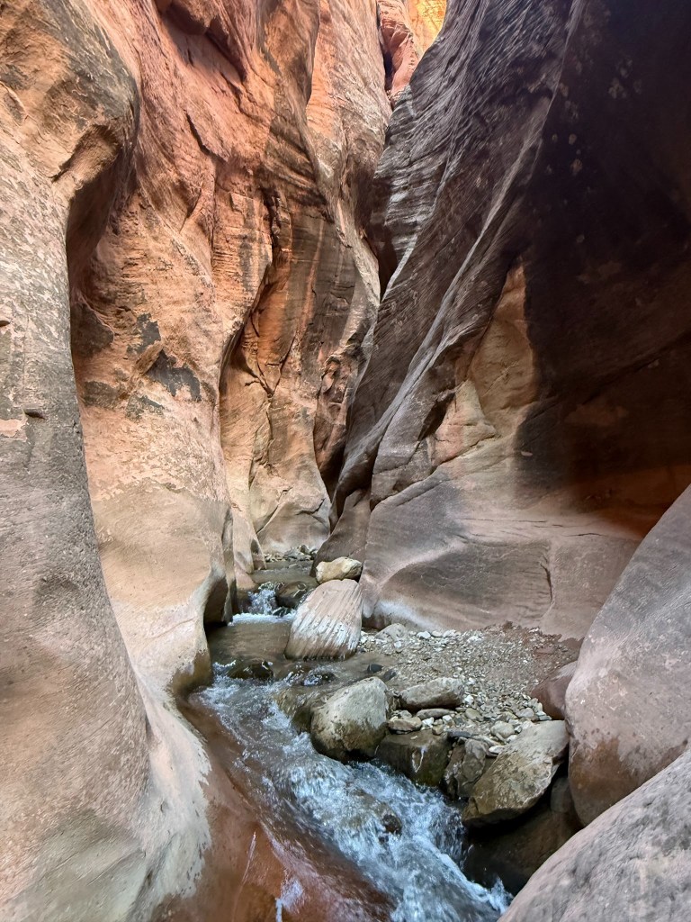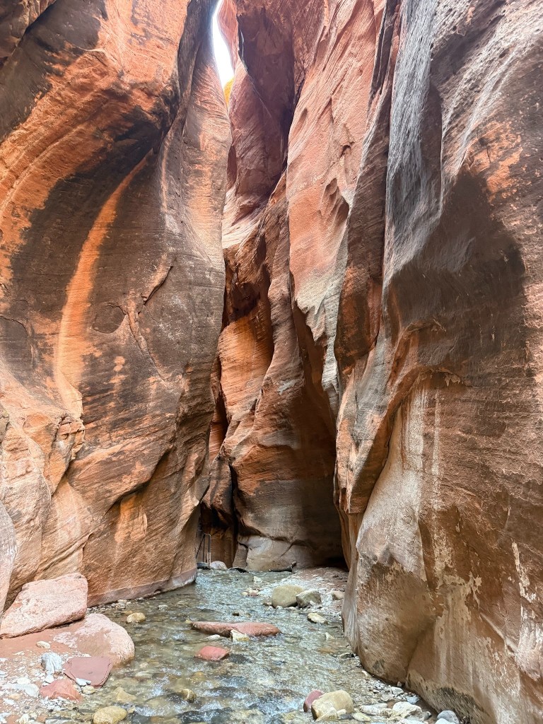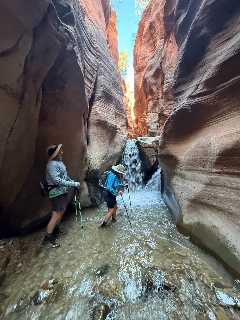 We probably travelled through the creek less 1/2 mile with the first 1 ½ miles being trail hiking. The last ¼ mile or so were in the narrow slots of the Canyon. They call the hike the Kanarran Falls Hike and nothing about the slot canyon to keep it on the down low. I think this is because the falls were nothing super special for us at least.