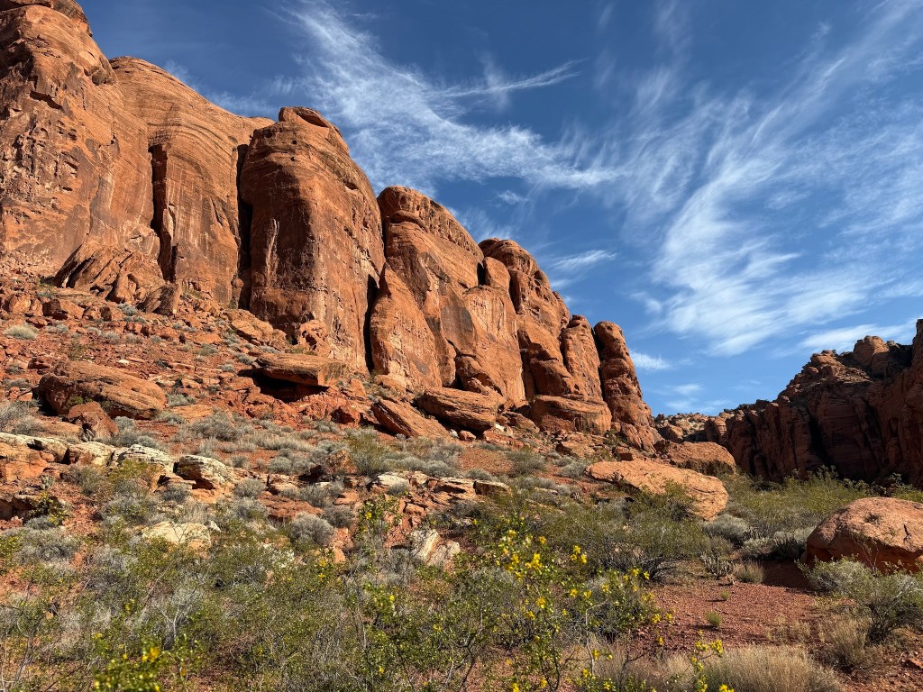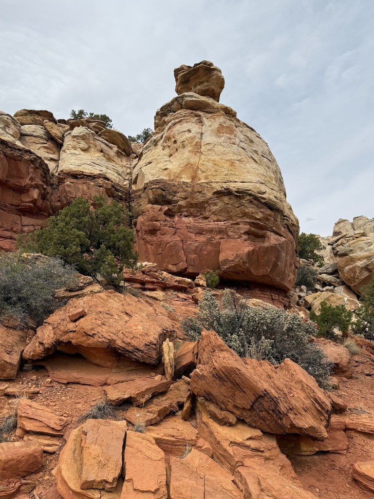 This trail has so many interesting and varied rock formations, from sandy washes to sandstone rock boulders. Erosion is all around in so many forms and then there are the slabs of rock that just crashed from the vertical walls to the canyon and maintain their flat features.