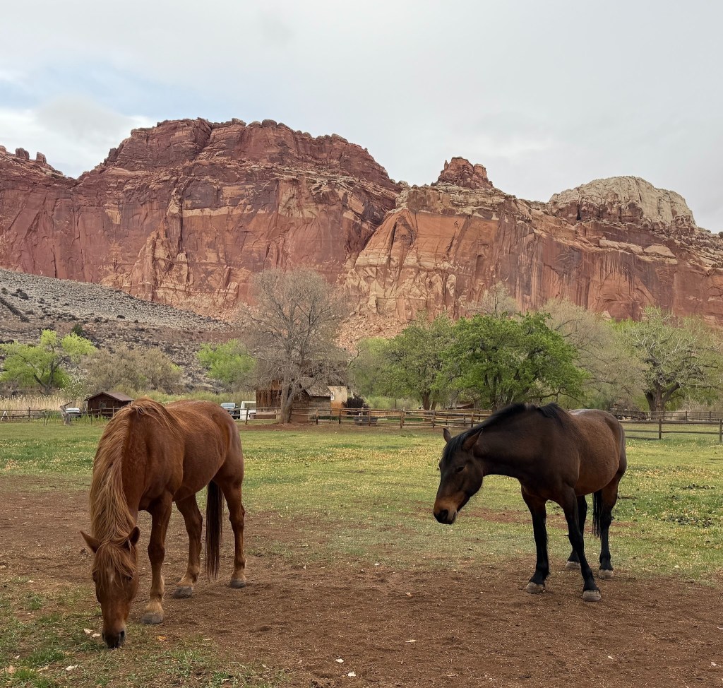 Capitol Reef has a long waterfold that allows water to be trapped for irrigation. The first Mormon settlers planted fruit trees which are still around the campground – evidently if you come in a harvesting season they allow you to pick fruit. A delightful barn with horses where one can pick up the Wi-Fi along the fence is the only connection to the outside.
