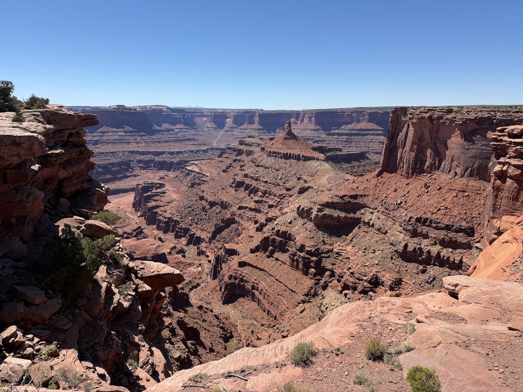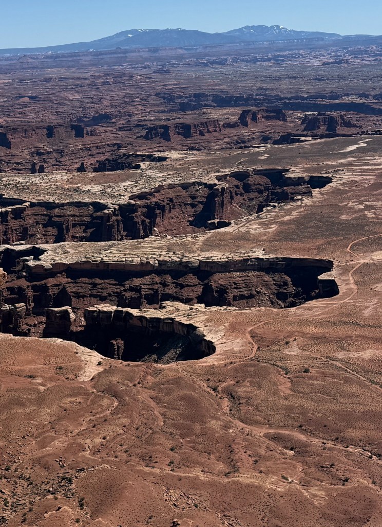 Island in the Sky – it is because much of it is a peninsula that somehow was not eroded away like the canyons all around that lay hundreds of feet below. We drove to the Grand View Point Overlook at the end of the “Island” and did the small hike to the end. A few dirt roads wind below the top on a level further down along the more canyons below.