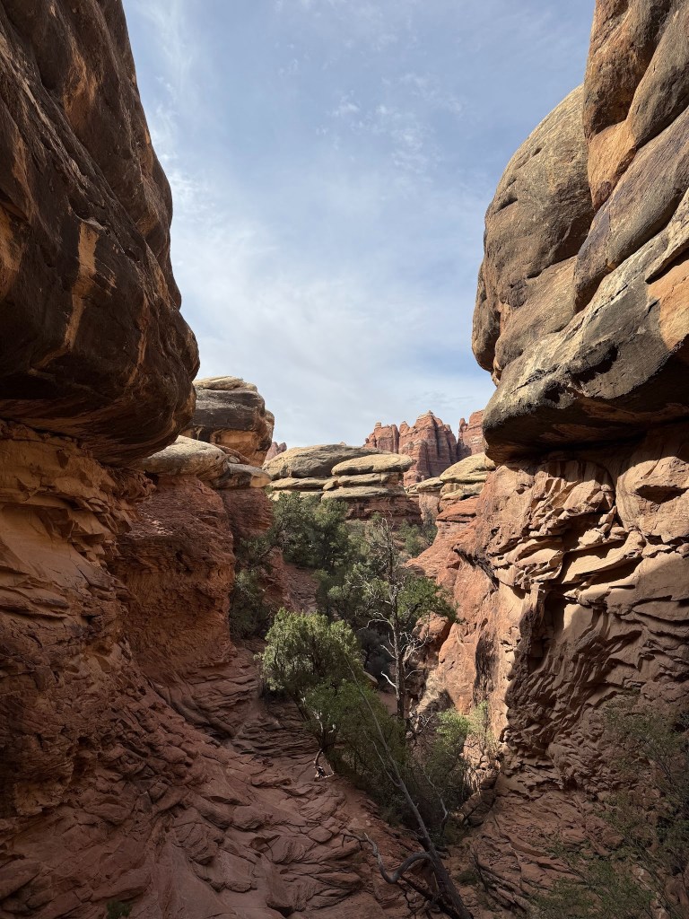 The best part of the hike was the wide variety – seeing the Island in the Sky on the far-off distances to hiking in the pin cushion, to traversing narrow slits and even a cave in the rocks. The hike was a lollipop, hiking few miles in before hitting the loop and finally returning on this same trail. The loop had the cool walk of several hundred feet through the narrow slot in the rock, but it also had the rather boring the few miles of dirt 4 X 4 road and a section through a field which wasn’t that exciting. The stem part of the lollipop provided most of the beautiful scenery and diversity in my opinion, so would highly recommend this out and back section section if time/ability doesn’t permit the entire hike.