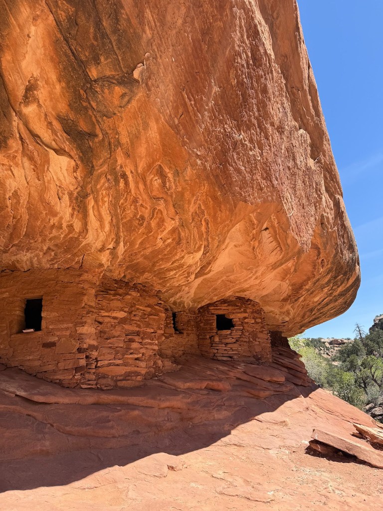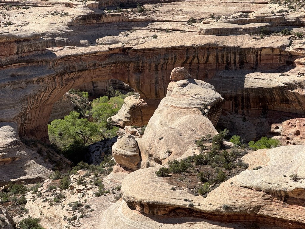 It was a bit warm to hike down all of them because that meant one must hike up too. We were given the tip that the last was the shortest, so when at the so named Natural Bridges Monument, at least one hike was required. It was nowhere as spectacular as Hickman Bridge in Capitol Reef, but it looks like it could fall away the soonest of all the bridges we have seen.