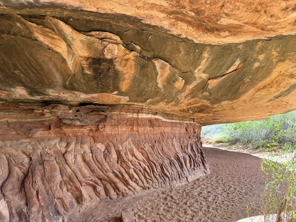 This is a small hike under a huge mushroom monolith where a spring trickled out and there were some non-desert green plants growing on the damp wall. It was a place that provided protection from the elements and even a bit of water for the cattle ranchers or first nation peoples of the land. In the near distance were some of the largest orange-red sandstone monolith castle fortresses in the area.