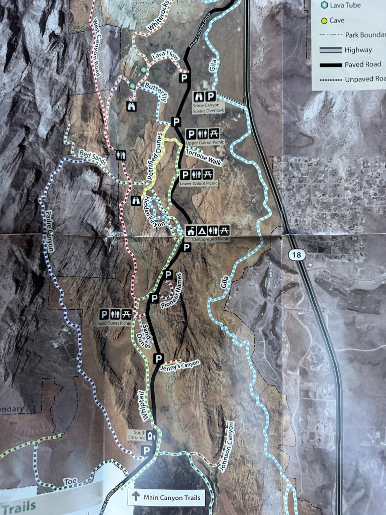 On the way up we discovered we could ride up the road – more like push our bikes up the road and access the Whiptail Trail through the Sand Dunes Parking Area. We had not realized this on the way down to Jenny. There are very few bike cross overs between the Snow Canyon Drive, the Whiptail and the West Trail.