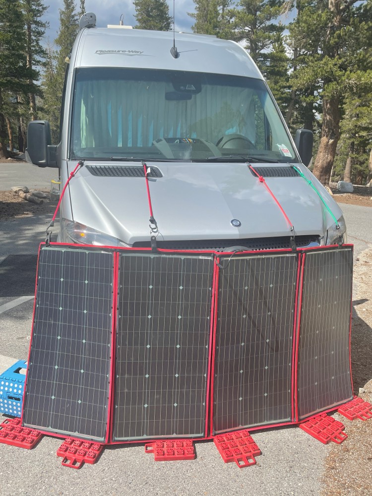 down to not functional. I don’t like the noise of the generator, so I tend to avoid turning it on when possible. We also almost never turn it on once a month like you are supposed to and have not had any problems with it starting when there is propane in the tank. We bought a flexible four Dokio Solar panels that fold up and fit perfectly between the bed and the wall. They fold to about 1 inch thick and run the length of the bed up sticking up about only about 2 inches into the window. We have gone a full week while in full sun without violating our marital voltage agreement. They provide 300 watts as long as the sun shines. The marital agreement is that if the battery is below 12.4 volts with no sun, then we run the generator for at least for 20 minutes before the end of the day. Of course when the sun comes out, the battery voltage pops up and usually is over 13 volts in most sunny places where we usually camp, this is the time to charge our devices. Camping on the east coast will be a new learning curve, although, most likely we will drive to hikes and places of interest that will charge Vinny up on a daily basis with the alternator. The solar panels are fastened to Vinny or a picnic table, for example, with the special tapestry clamps(already explained previously) and bungy chord along Vinny’s door handles or windshield wiper crevasses. Although we haven’t generally dealt with overcast rainy weather, we do deal with wind that could cause this 17 pound high surface area item to easily blow away. We have purchased an extra 50ft worth of extension cable to the Dokio controller box to allow for sun placement even if there are lots of trees. This cable is wrapped and hooked up into a corner molding between the microwave that sticks out 2 inches from the rest of the wall, taking up somewhat unusable space, yet allows the microwave door to open freely. The Dokia inverter controller box is stored in the Vinny’s glove box with required standard cables in the provided pocket of the outside solar panel. The battery terminals under the hood are hooked up to the controller box with one of these cable and the other cable coming out of the controller box is attached to the solar panel, all with idiot proof, only one way to connect with diagrams of the solar panel and battery directly printed on the box. This is where the extension cable fits to extend the panels to wherever there is sun. The Dokio inverter box must lie near the battery somewhere due to cable length and I hook up this light weight important item with an S hook into Vinny’s grill. The inverter box has been placed in a zip up pencil pouch allowing for the cords to come out but provide a bit of protection against the sun and rain. The voltage coming out of the battery can be viewed if the pencil pouch has a clear sleeve and it hooks sturdily to the grill. Additionally this inverter has direct USB connections and phones and my watch can be directly charged with it. I have observed that if my phone goes into the red, I get a phone message that says charging is not taking place with this system. We always carry an Ankar battery that can charge a tablet and several phones. By then, we usually get to some electrons on the grid. I am a bit concerned that the edges of the canvass of the back of the panels will get worn and separate from the actual panels, severe fading has already occurred, but there has been no separation after two years, stitching holding. Keeping our fingers crossed, or the duct tape supplies will need to be increased.